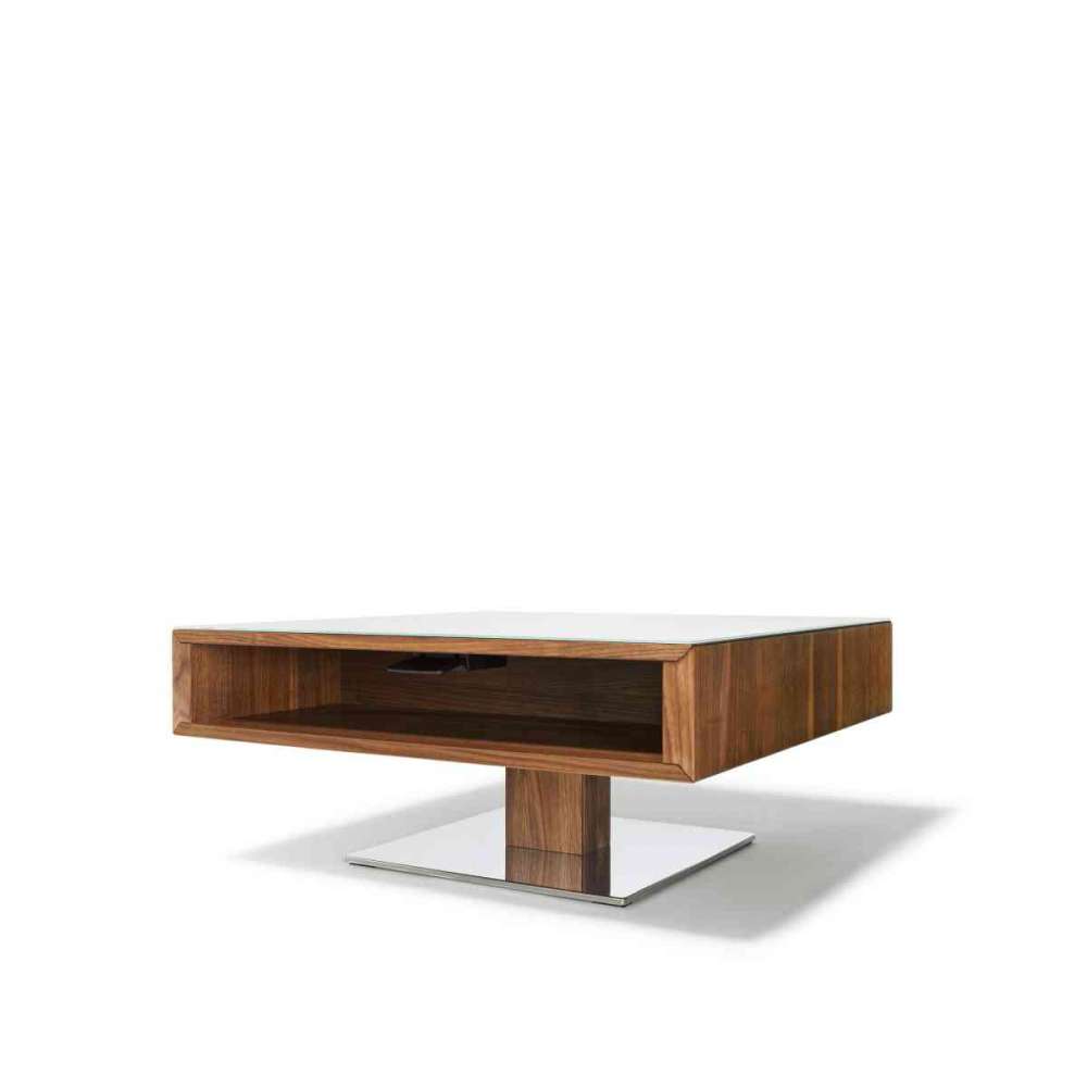 Kwadratowy blat jest dostępny z czystego naturalnego drewna lub ze szklanym blatem. Matowa lub błyszcząca chromowana środkowa noga zapewnia maksymalną stabilność i sprawia wrażenie lekkości.