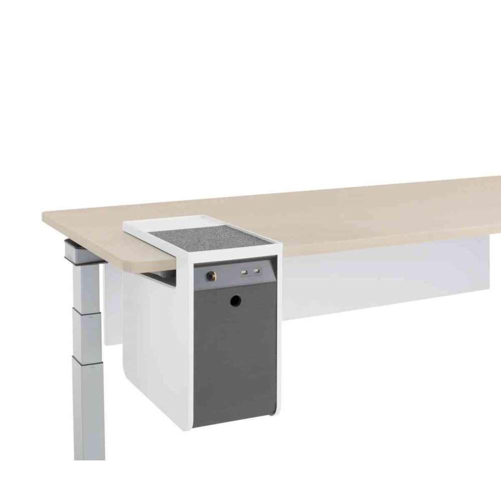 Zmieniają się potrzeby w zakresie przechowywania. Zmniejsza się ilość akt papierowych i fizycznych materiałów referencyjnych, a rośnie liczba technologii osobistych wykorzystywanych w pracy. Konsola osobista zapewnia bezpieczne przechowywanie toreb, laptopów i innych przedmiotów osobistych i zawodowych. Można go montować na powierzchniach roboczych o stałej i stojącej wysokości, a także ma zintegrowane opcje ładowania, dzięki którym mała technologia jest zasilana przez cały dzień.