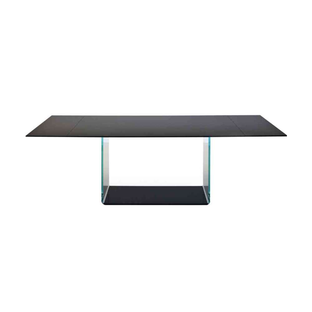 Stół do jadalni z bardzo lekką podstawą z giętego szkła i lakierowaną częścią opartą, różne wykończenia. Blat hartowany lub laminowany w różnych wymiarach, materiałach i wykończeniach.