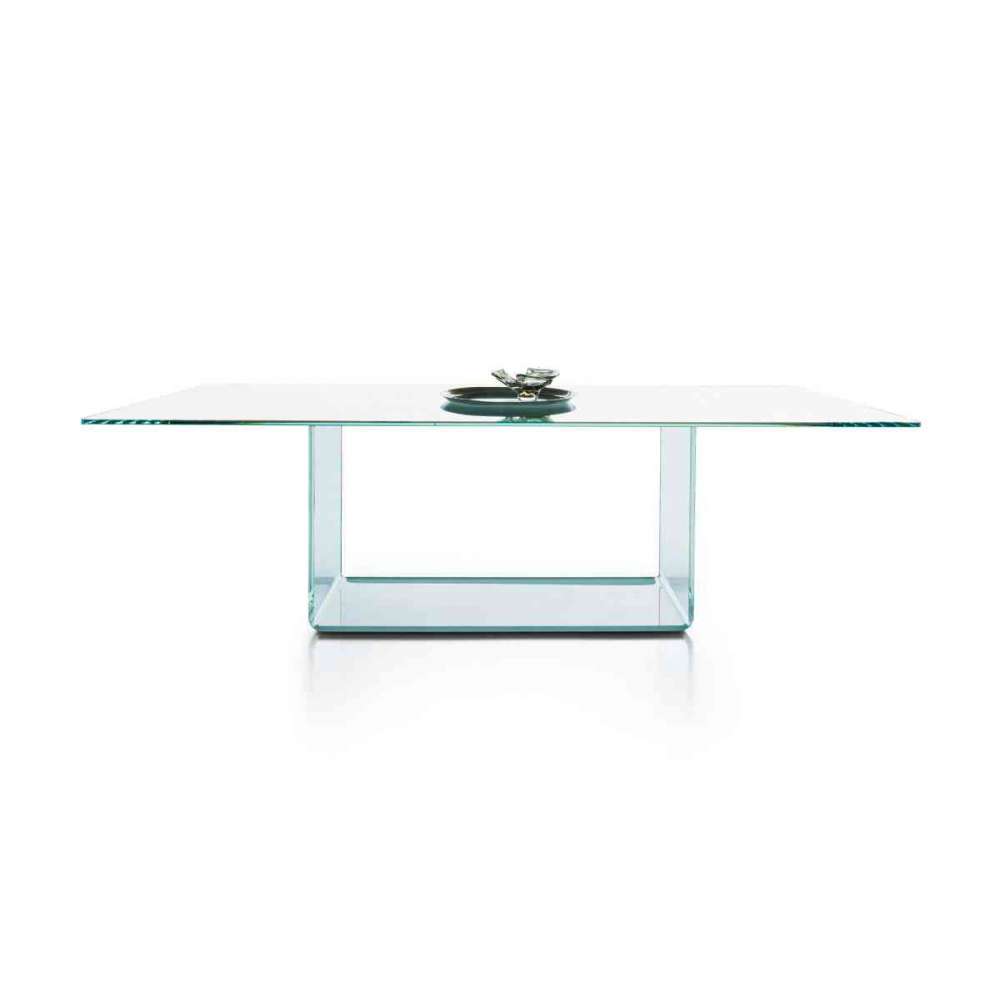 Stół do jadalni z bardzo lekką podstawą z giętego szkła i lakierowaną częścią opartą, różne wykończenia. Blat hartowany lub laminowany w różnych wymiarach, materiałach i wykończeniach.