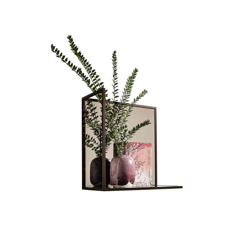 Witryna/półka ze strukturą z lakierowanego metalu, w kolorze mokka lub z oksydowanym wykończeniem. Półka i tył dostępne w kolorze lustro przydymione lub brąz.