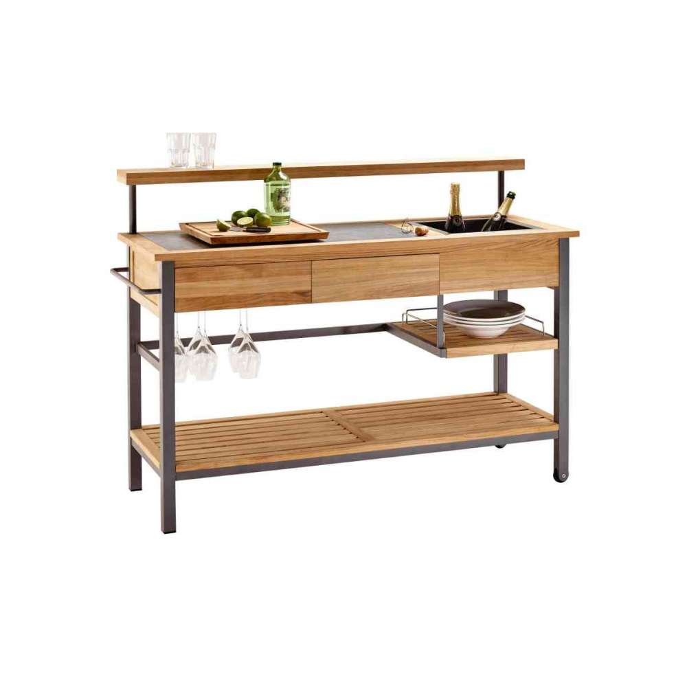 BUTLER to praktyczne, mobilne stanowisko pracy o ponadczasowym designie oferujące wiele funkcji. Ten wózek kuchenny – składający się z ramy ze stali nierdzewnej i modułów z drewna tekowego – zapewnia blaty do przygotowywania posiłków, dużo miejsca do przechowywania przyborów kuchennych, chłodziarkę do napojów i wiele innych przydatnych akcesoriów. BUTLER jest idealnym towarzyszem grilla i przyjęć w ogrodzie.