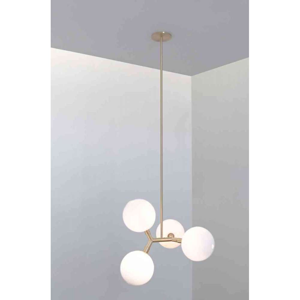 Wisiorek Veer składa się z czterech świecących kul z ręcznie dmuchanego czeskiego szkła, osadzonych na czteroramiennej mosiężnej konstrukcji i zawieszonych na sztywnym mosiężnym trzpieniu. Szkło jest dostępne w dwóch rozmiarach – 4 1/2″ (11 cm) lub 7″ (18 cm) średnicy – i pięciu kolorach szkła. Szkło ma charakterystyczne podwójnie zanurzone, polerowane ustniki SkLO, które pokazują, gdzie szkło jest pęknięte w rurze dmuchawy, dzięki czemu każde jest wyjątkowe.
