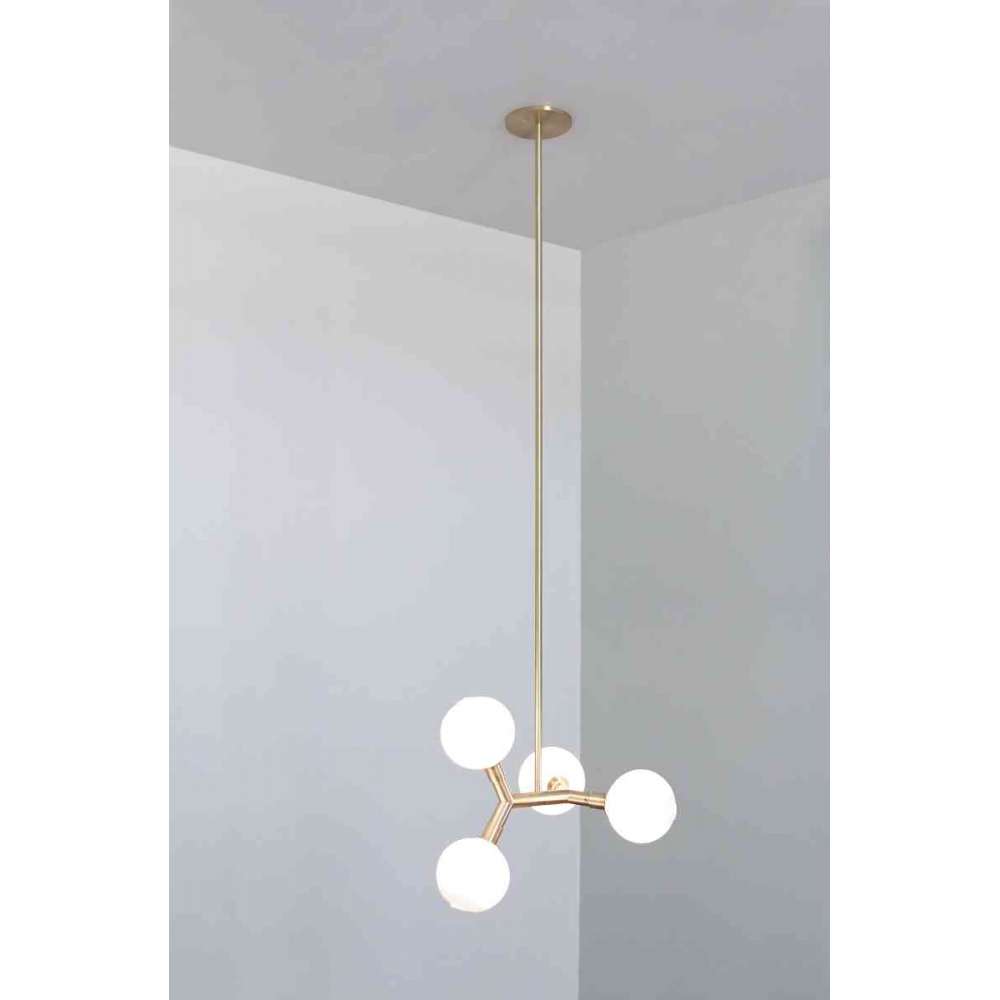 Wisiorek Veer składa się z czterech świecących kul z ręcznie dmuchanego czeskiego szkła, osadzonych na czteroramiennej mosiężnej konstrukcji i zawieszonych na sztywnym mosiężnym trzpieniu. Szkło jest dostępne w dwóch rozmiarach – 4 1/2″ (11 cm) lub 7″ (18 cm) średnicy – i pięciu kolorach szkła. Szkło ma charakterystyczne podwójnie zanurzone, polerowane ustniki SkLO, które pokazują, gdzie szkło jest pęknięte w rurze dmuchawy, dzięki czemu każde jest wyjątkowe.