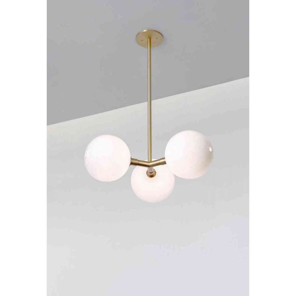 Wisiorek Trzon 3x to minimalistyczny wisiorek składający się z trzech świecących kul z ręcznie dmuchanego czeskiego szkła, osadzonych na trójramiennej poziomej armaturze i zawieszonych na sztywnym mosiężnym trzpieniu. Szkło jest dostępne w dwóch rozmiarach – 4 1/2″ (11 cm) lub 7″ (18 cm) średnicy – i pięciu kolorach szkła. Szkło ma charakterystyczne podwójnie zanurzone, polerowane ustniki SkLO, które pokazują, gdzie szkło jest pęknięte w rurze dmuchawy, dzięki czemu każde jest wyjątkowe.