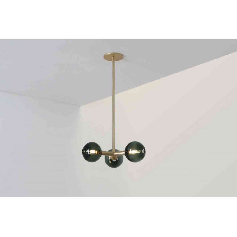 Wisiorek Trzon 3x to minimalistyczny wisiorek składający się z trzech świecących kul z ręcznie dmuchanego czeskiego szkła, osadzonych na trójramiennej poziomej armaturze i zawieszonych na sztywnym mosiężnym trzpieniu. Szkło jest dostępne w dwóch rozmiarach – 4 1/2″ (11 cm) lub 7″ (18 cm) średnicy – i pięciu kolorach szkła. Szkło ma charakterystyczne podwójnie zanurzone, polerowane ustniki SkLO, które pokazują, gdzie szkło jest pęknięte w rurze dmuchawy, dzięki czemu każde jest wyjątkowe.