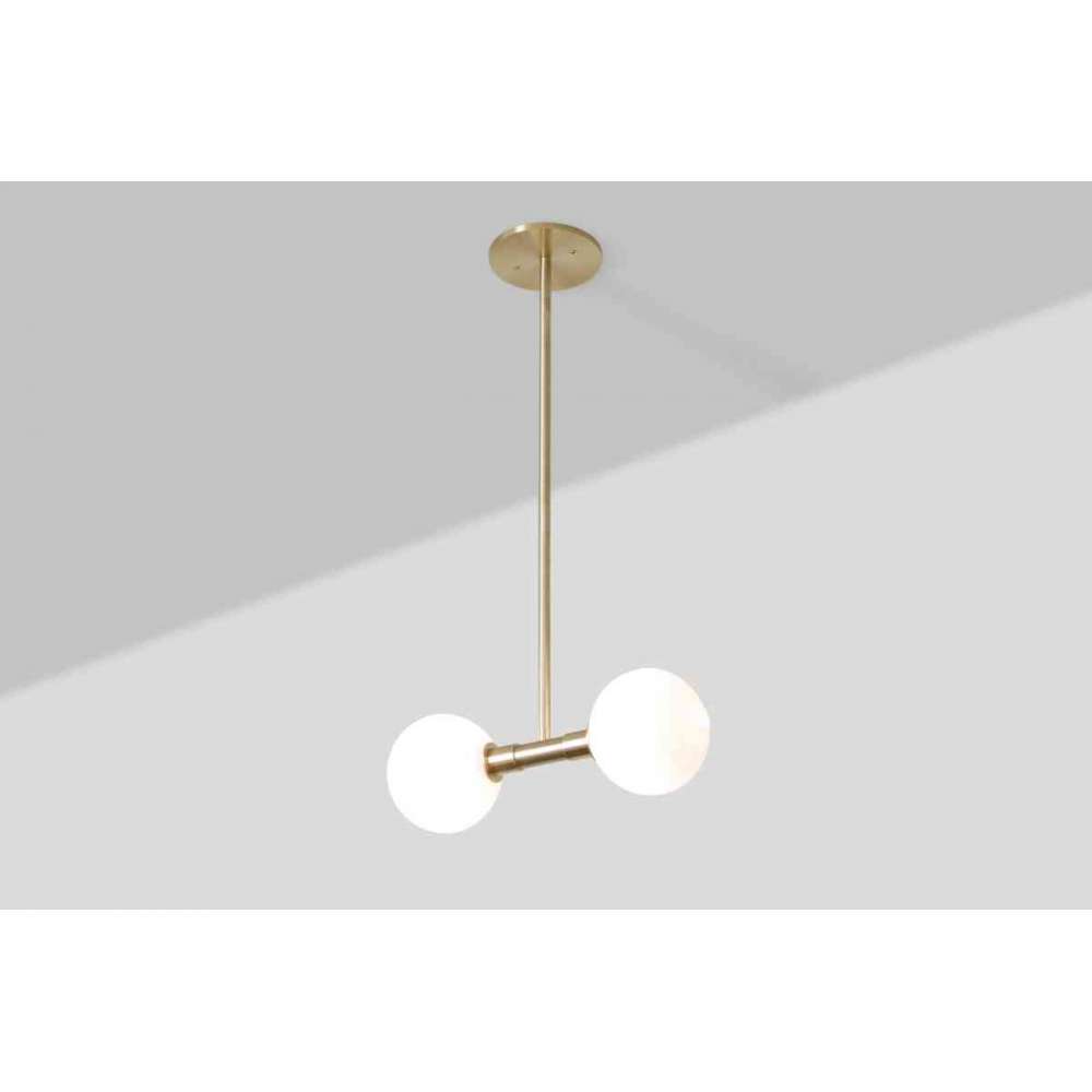 Wisiorek Trzon 2x to minimalistyczny wisiorek składający się z pary świecących kul z ręcznie dmuchanego czeskiego szkła zawieszonych na sztywnym mosiężnym trzpieniu. Kule mają średnicę 4 1/2 cala (11 cm) i są dostępne w pięciu kolorach szkła. Szkło ma charakterystyczne dla SkLO podwójnie zanurzone, polerowane ogniowo usta, które pokazują, gdzie szkło jest stłuczone z rury dmuchawy, dzięki czemu każde jest wyjątkowe .