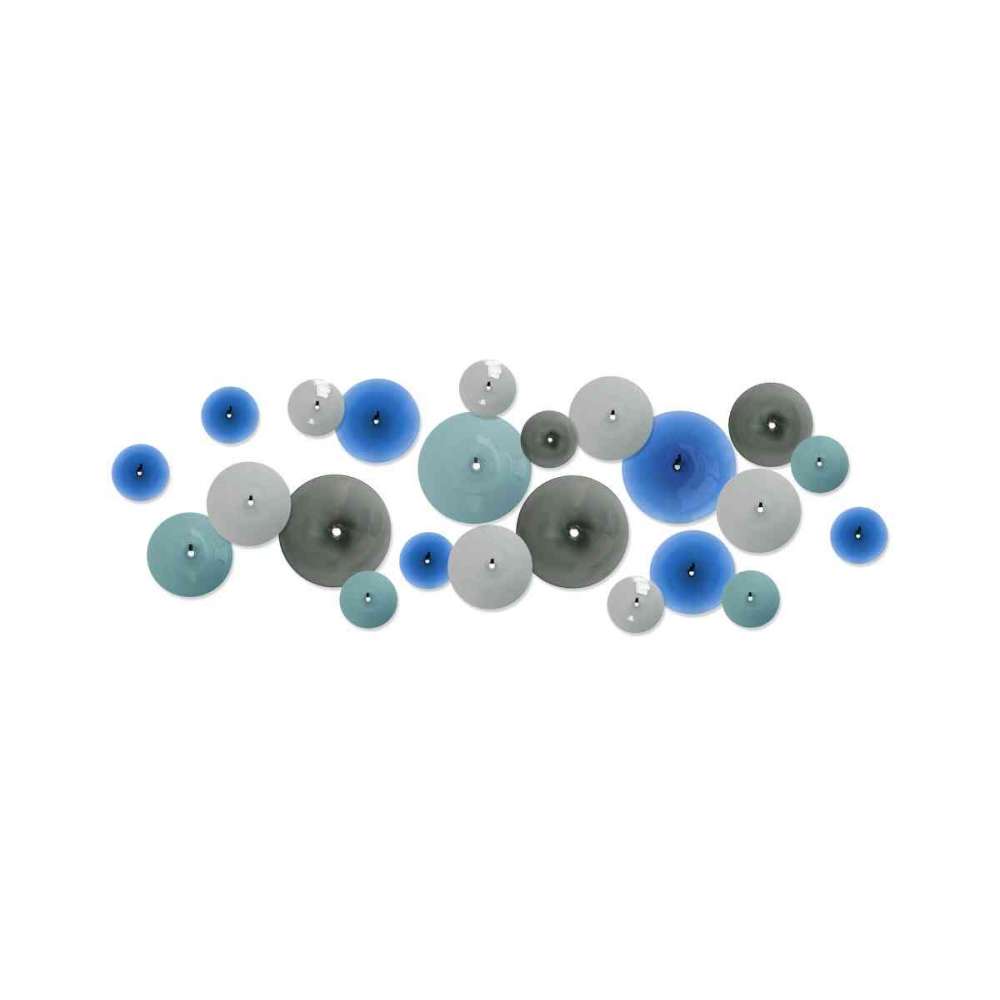 Gotowa do montażu na ścianie kompozycja elementów ściennych do basenów SkLO: krążki z ręcznie dmuchanego szkła z otwartymi ustami pośrodku, gdzie elementy są odłamywane od fajki mistrza szkła i polerowane ogniowo, co nadaje każdemu niepowtarzalny detal. Są zawieszone na ręcznie wykonanych stalowych uchwytach ściennych.
