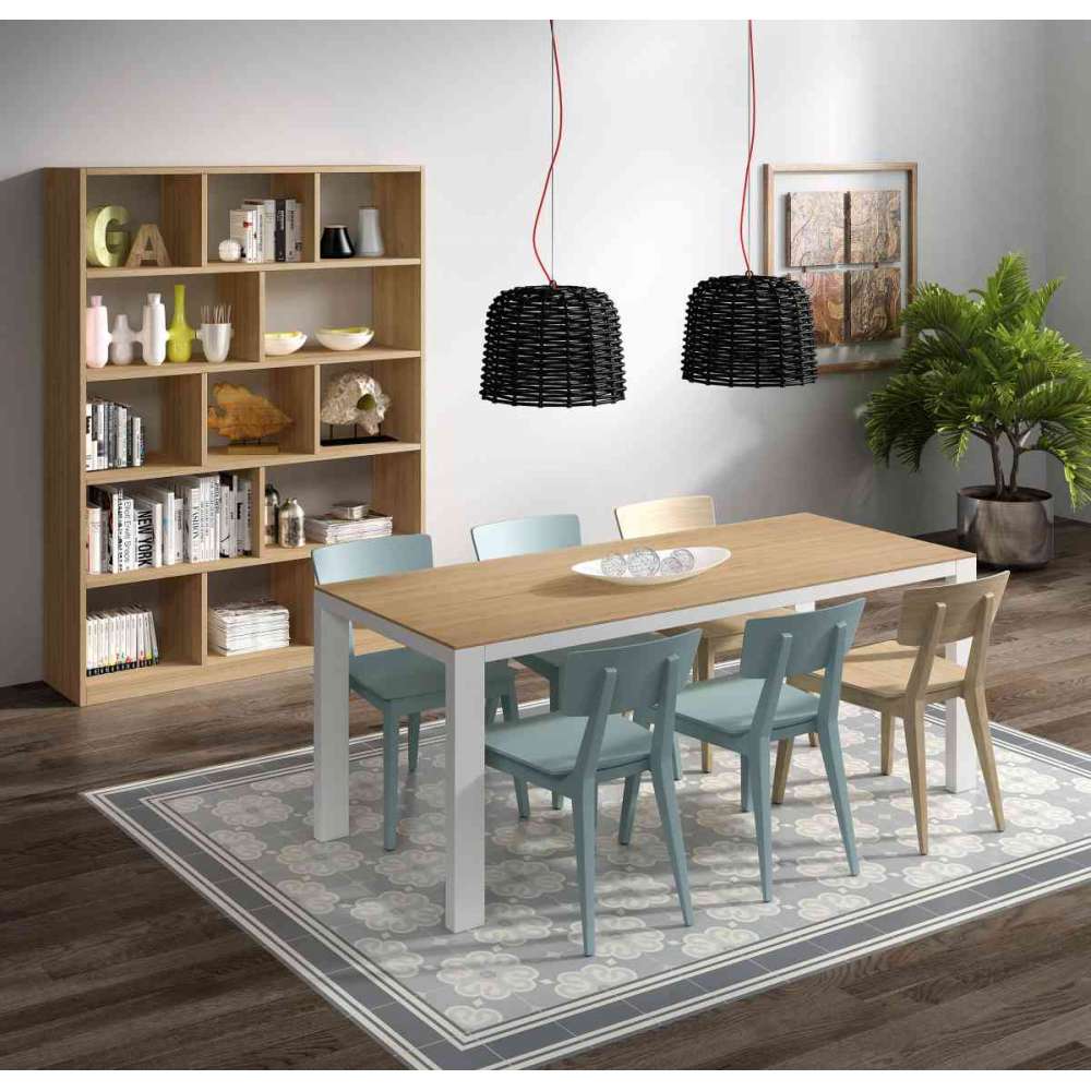 Stół Simetria, anodowany na srebrno, aluminiowa konstrukcja lakierowana na kolor czarny, biały lub RAL. Blat z tego samego lakieru, forniru, szkła, kompaktu, marmuru lub litego drewna.