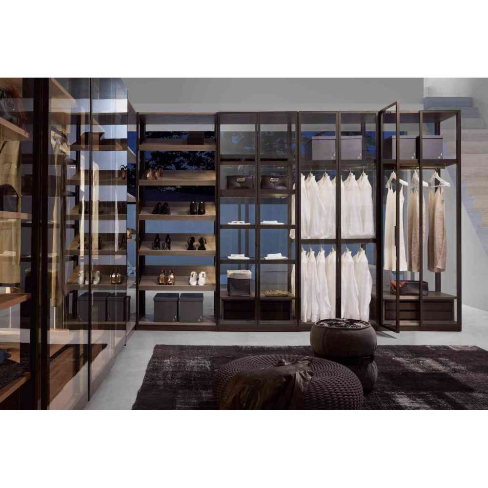 Szafa z zawiasami obrotowymi z aluminiową ramą i szklanym panelem.