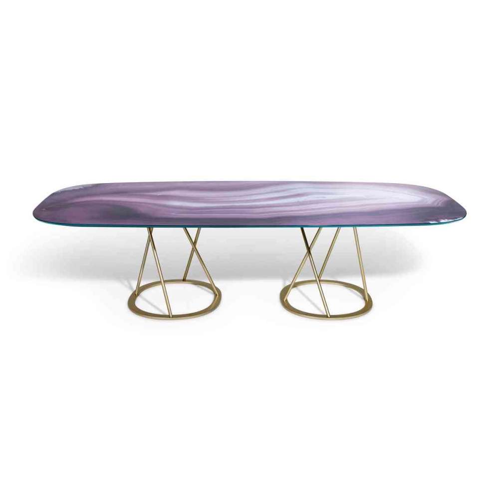 Stół wykonany ze stali nierdzewnej, z dwoma różnymi wykończeniami: antyczny brąz i szampańskie wykończenie. Blat ze szkła Vetrite Gem Agata Lilla lub Vetrite Caleidos. x gł.: 51 1/8" x wys.: 28 3/8"