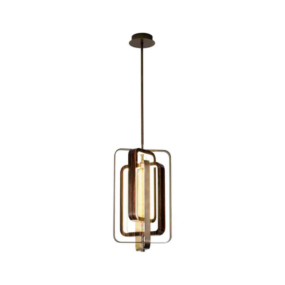 Lampa z brązową metalową ramą i wyłożonym szkłem pireksowym. Dekoracyjne wstawki z polerowanego hebanu.