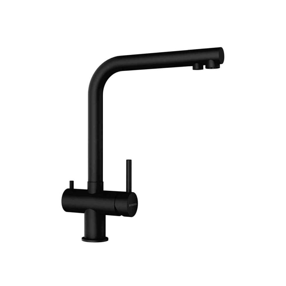 SCHOCK Vitus to imponująca, nowoczesna bateria kuchenna w kształcie litery L z wysoką wylewką i oddzielną wylewką do wody pitnej.