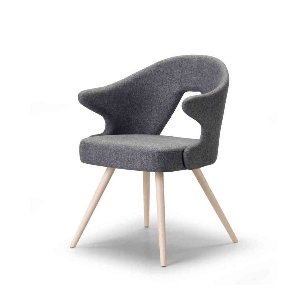 Dane techniczne: krzesło i fotel z drewnianymi nogami i tapicerowanym siedziskiem. Nogi z litego buku w bielonym wykończeniu. Siedzisko i oparcie z giętej sklejki, w całości tapicerowane. Tapicerka z tkaniny lub imitacji skóry. Siedzisko i oparcie można dostosować za pomocą różnych lub kontrastujących tkanin.