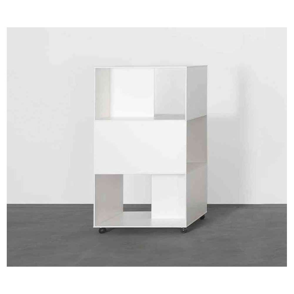 meble wielozadaniowe. hpl czarny lub biały. macierz jest budowana piętrowo. można wybierać pomiędzy trzema różnymi wysokościami każdej półki i łączyć je. wewnętrzne przegrody lub opcjonalne panele tylne zapewniają stabilność. rolki lub nóżki, opcjonalne szuflady.