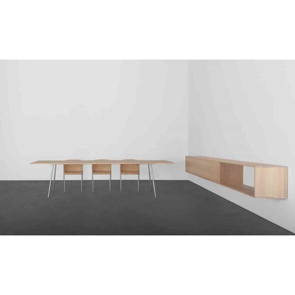 tabela. blat hpl biały lub czarny lub drewniany (dąb, trzy warstwy drewna litego, dąb wielowarstwowy lub wielowarstwowo powlekany czarny lub biały). w delikatnej ramie wykonanej z okrągłego pręta stalowego (czarny lub biały lub matowy) dostępne są przepusty kablowe i korytka kablowe. blat prostokątny lub okrągły lub owalny.