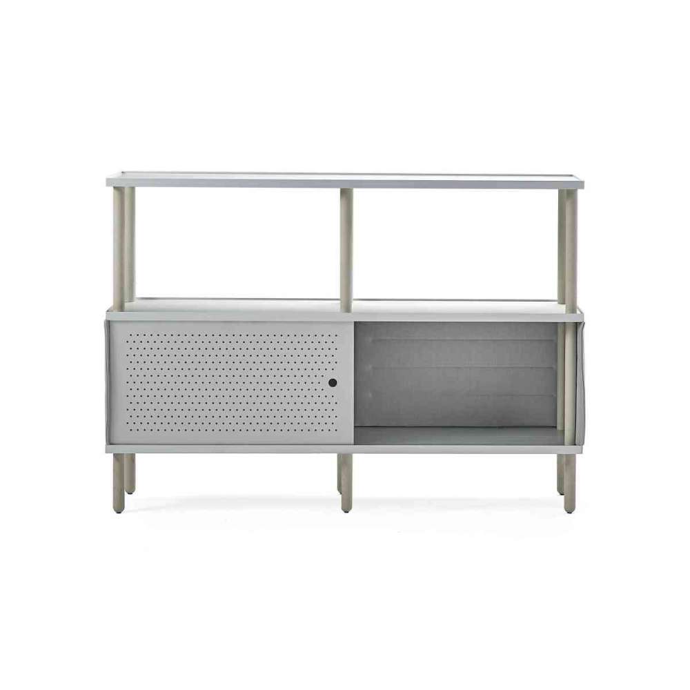 Aluminiowe półki stanowią platformę na których zbudowane jest wszystko inne. Dębowe filary i stopy przykręca się, tworząc konstrukcję, którą następnie zdobią perforowane aluminiowe lub tapicerowane drzwi i panele. Perforowane aluminiowe drzwi stanowią atrakcyjny kontrast, jednocześnie minimalizując zakłócenia akustyczne. Wysoce konfigurowalny projekt mebla wykracza poza jego funkcję przechowywania, ponieważ może być używany jako kredens, regał, stolik telewizyjny lub ścianka działowa. Dodaj koła, aby stworzyć wózek lub wymyśl własny przypadek użycia!