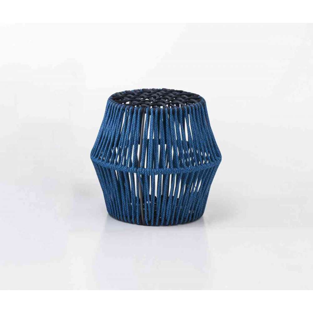 Kolekcja puf i stolików kawowych wykonanych z żelaznych prętów i plecionych kabli z barwionego pastą poliestru HT, zmieszanych razem jak farby na palecie artysty.