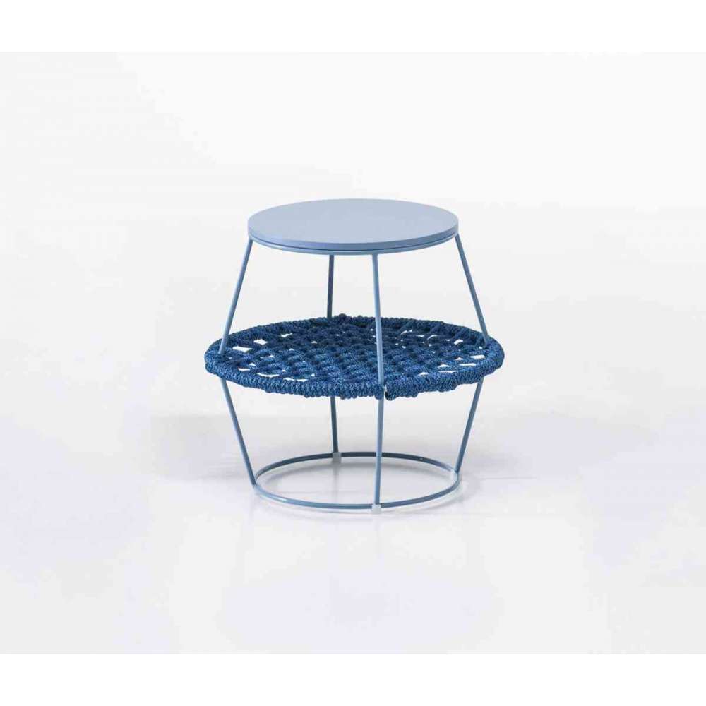 Kolekcja puf i stolików kawowych wykonanych z żelaznych prętów i plecionych kabli z barwionego pastą poliestru HT, zmieszanych razem jak farby na palecie artysty.