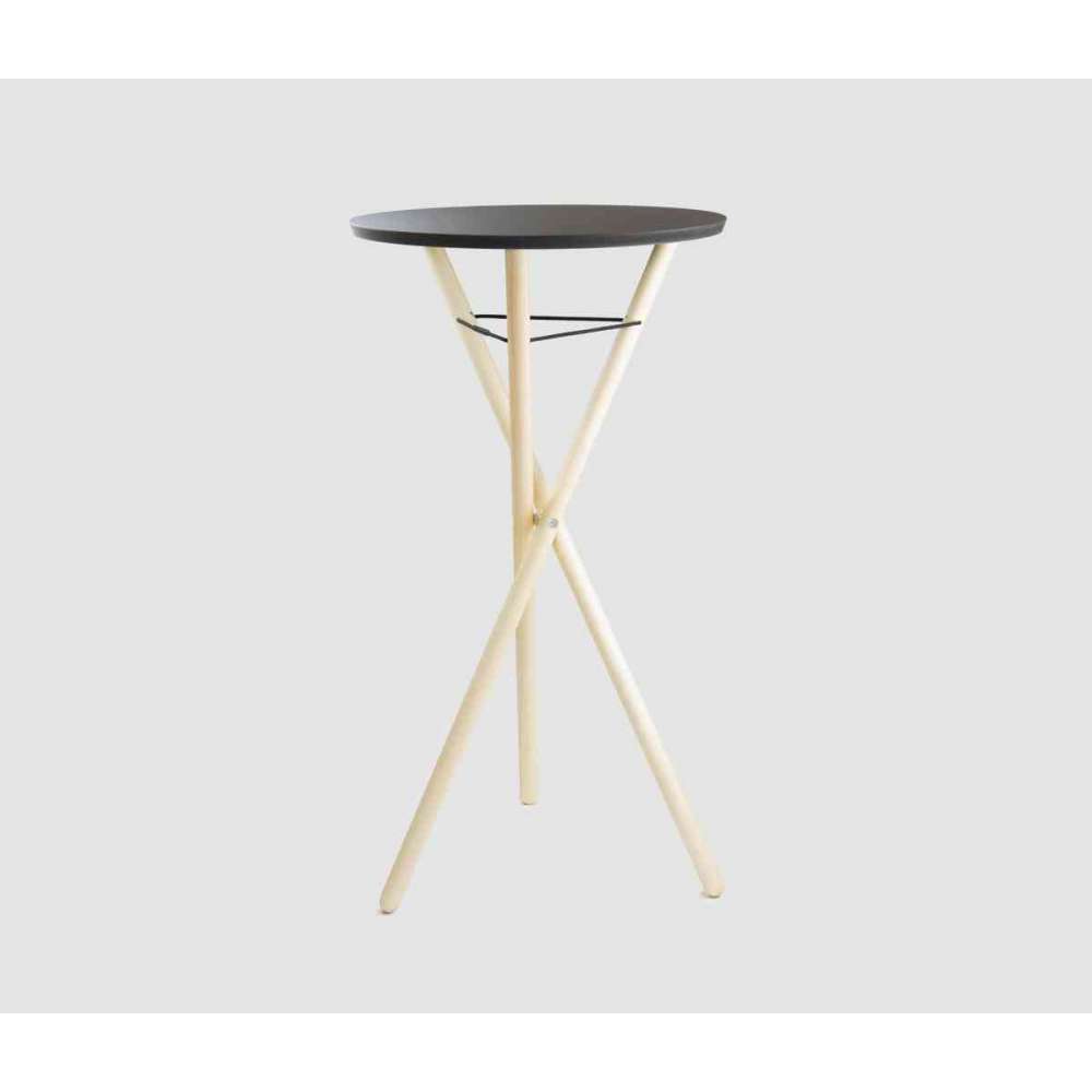 Blat wysokiego stołu mocowany jest do trójnożnego trójnogu wykonanego z olejowanego drewna dębowego lub jesionowego za pomocą magnesów, co pozwala na łatwy demontaż. Samą podstawę można złożyć w kompaktowy zestaw jednym ruchem nadgarstka za pomocą osi pośrodku i równie szybko ponownie ustawić w razie potrzeby. Blat Meet and Greet wykonany jest z barwionej na czarno płyty MDF – powierzchnia pokryta jest solidną, matową powłoką HPL w kolorze czarnym, która nie pozostawia prawie żadnych widocznych odcisków palców.