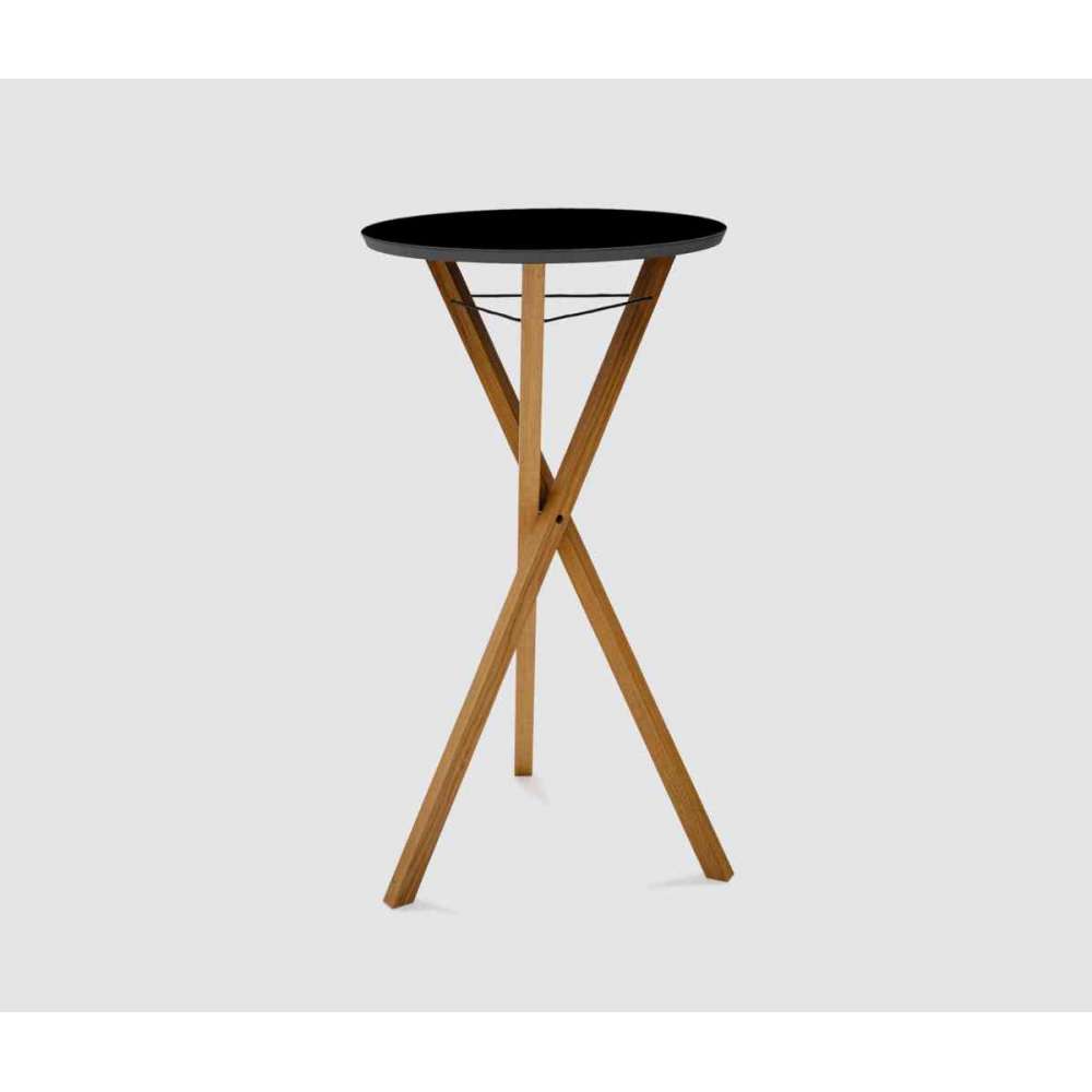 Blat wysokiego stołu mocowany jest do trójnożnego trójnogu wykonanego z olejowanego drewna dębowego lub jesionowego za pomocą magnesów, co pozwala na łatwy demontaż. Samą podstawę można złożyć w kompaktowy zestaw jednym ruchem nadgarstka za pomocą osi pośrodku i równie szybko ponownie ustawić w razie potrzeby. Blat Meet and Greet wykonany jest z barwionej na czarno płyty MDF – powierzchnia pokryta jest solidną, matową powłoką HPL w kolorze czarnym, która nie pozostawia prawie żadnych widocznych odcisków palców.