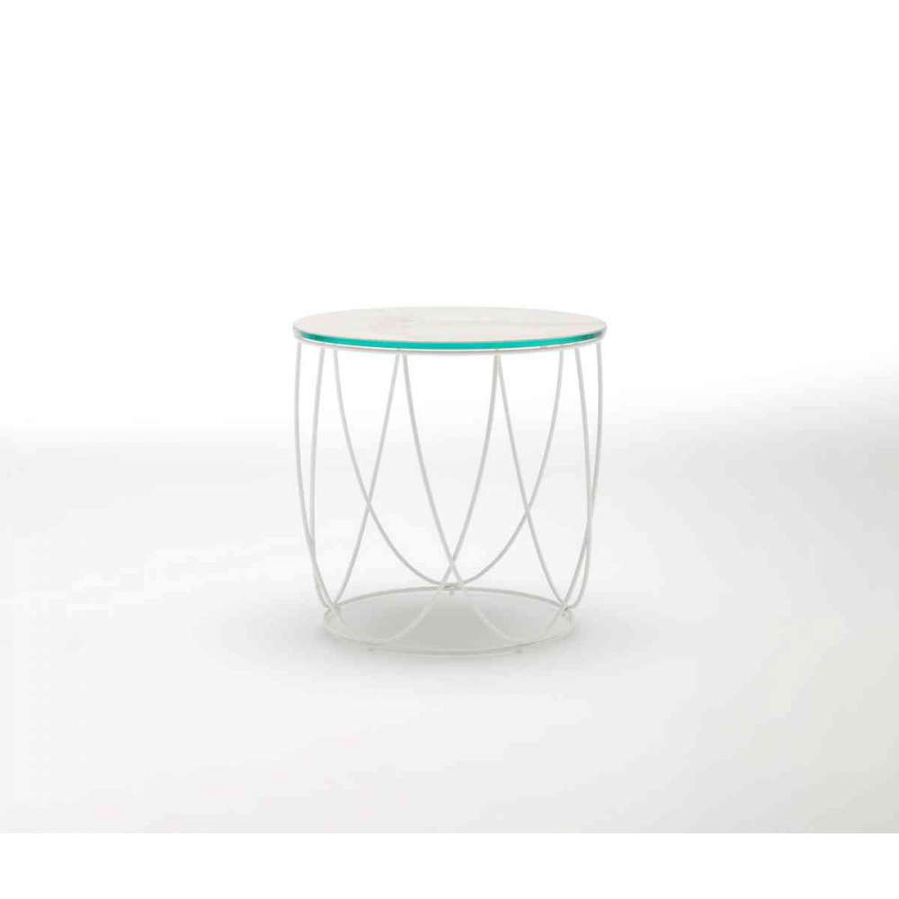 Stolik boczny zawsze składa się z dolnej ramy dostępnej w dwóch różnych kolorach oraz blatu dostępnego w dwóch różnych powierzchniach ceramicznych (laminowanych na szkle).