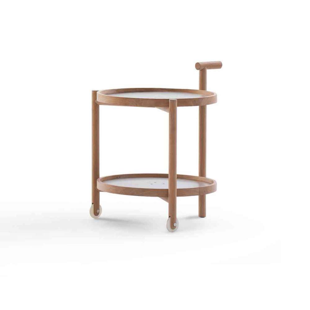 Kolekcja CADDY urzeka lekką elegancją zaokrąglonej ramy i przyciąga wielofunkcyjnością: dwa blaty ze stali nierdzewnej wózki barowe są wyjmowane i mogą służyć jako stylowe tace.
