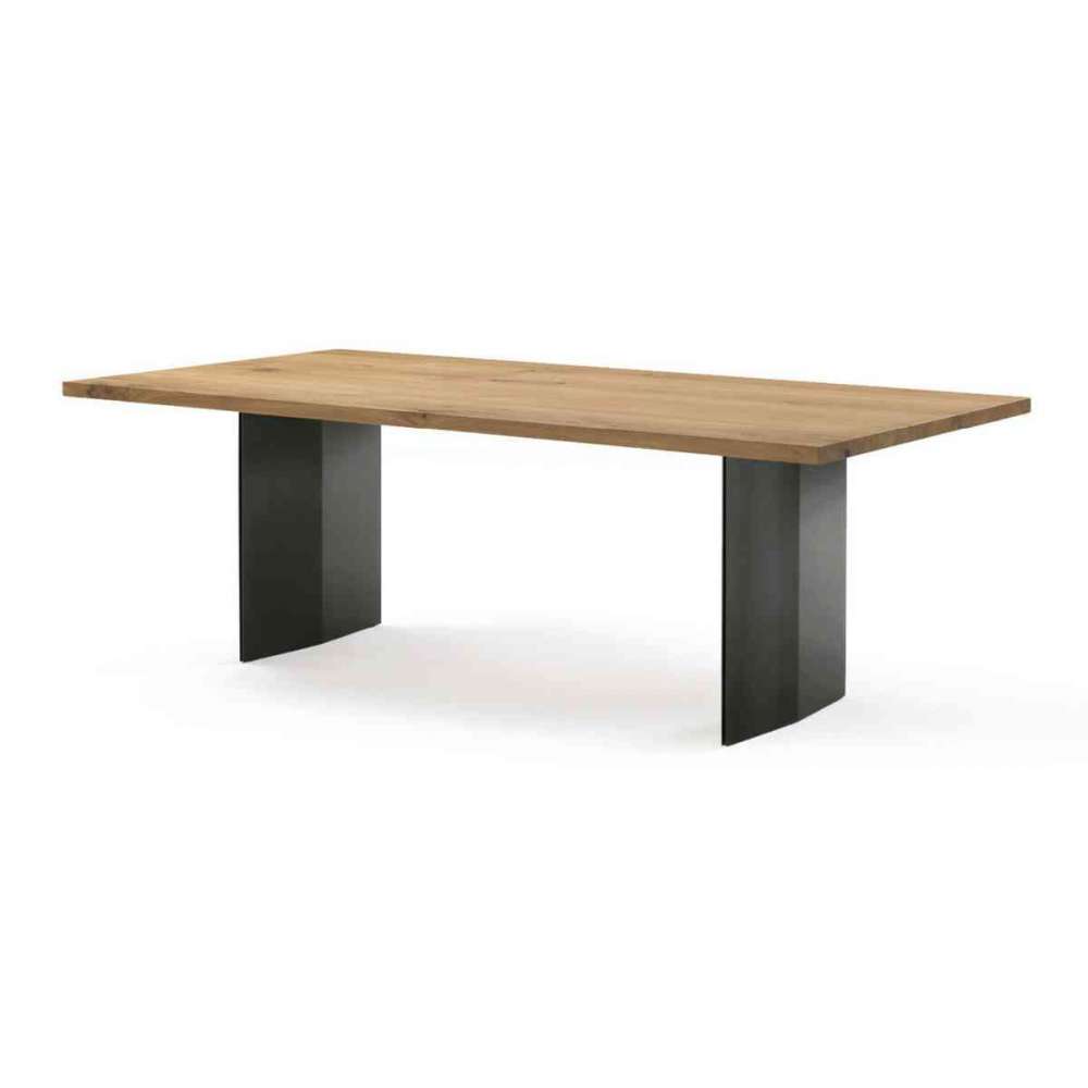 Stół z blatem z litego drewna w listwach klejonych, z prostymi bokami, w połączeniu z żelaznymi nogami charakteryzującymi się podwójną blachą półskładaną na kształt rombu.