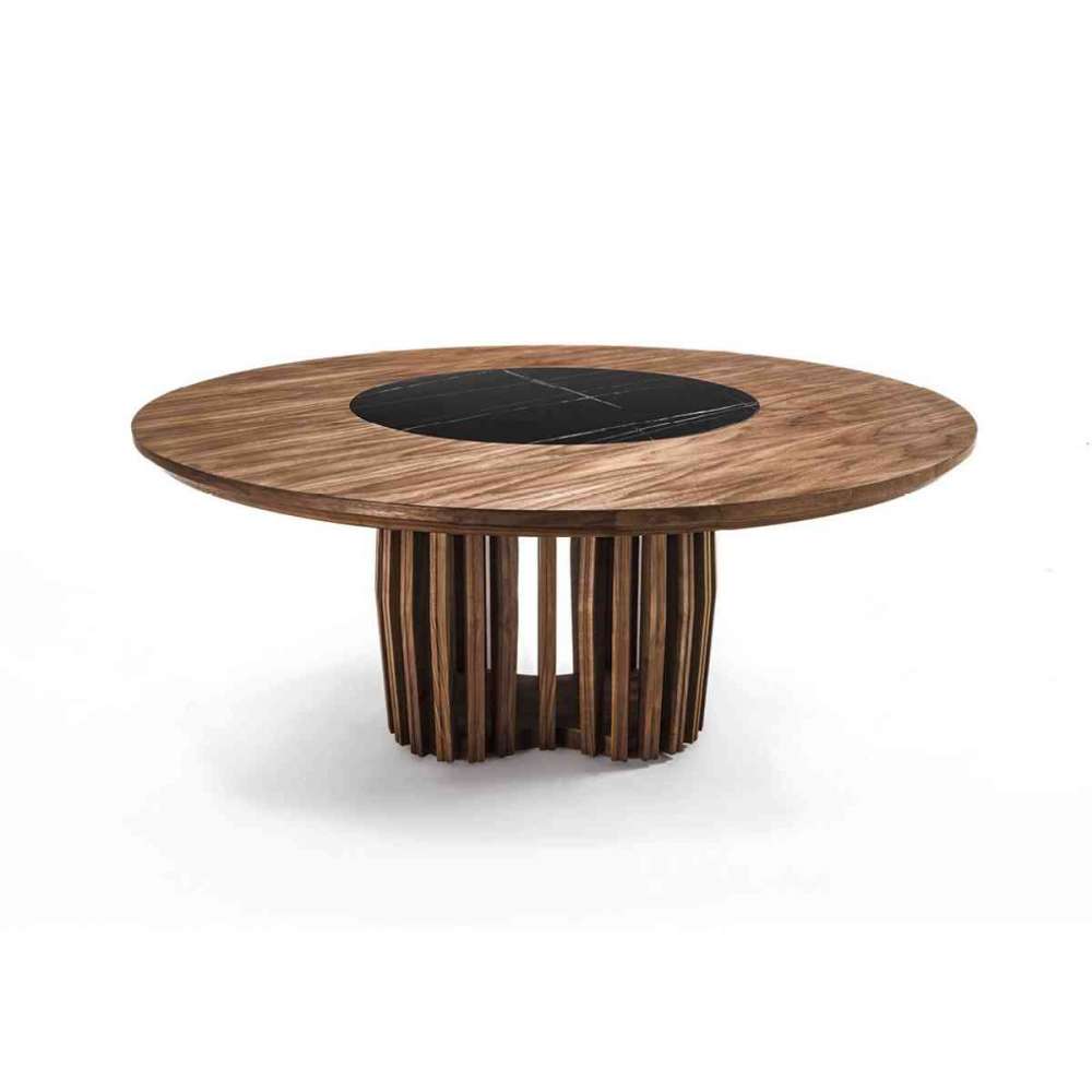 Okrągły stół z blatem z płyty stolarskiej fornirowanej i krawędziami z litego drewna, z możliwością dodania środkowej wstawki z drewna lub marmuru, wyposażony w system obrotowy Lazy Susan. Podstawa z listew z litego drewna przedstawia symbol nieskończoności.
