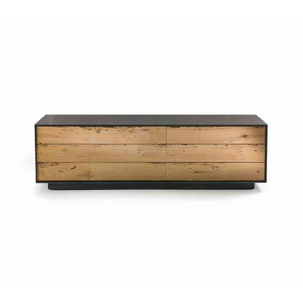 Kredens z litego drewna i płyty stolarskiej, z żelazną lub drewnianą ramą, charakteryzujący się szufladami montowanymi na jaskółczy ogon.