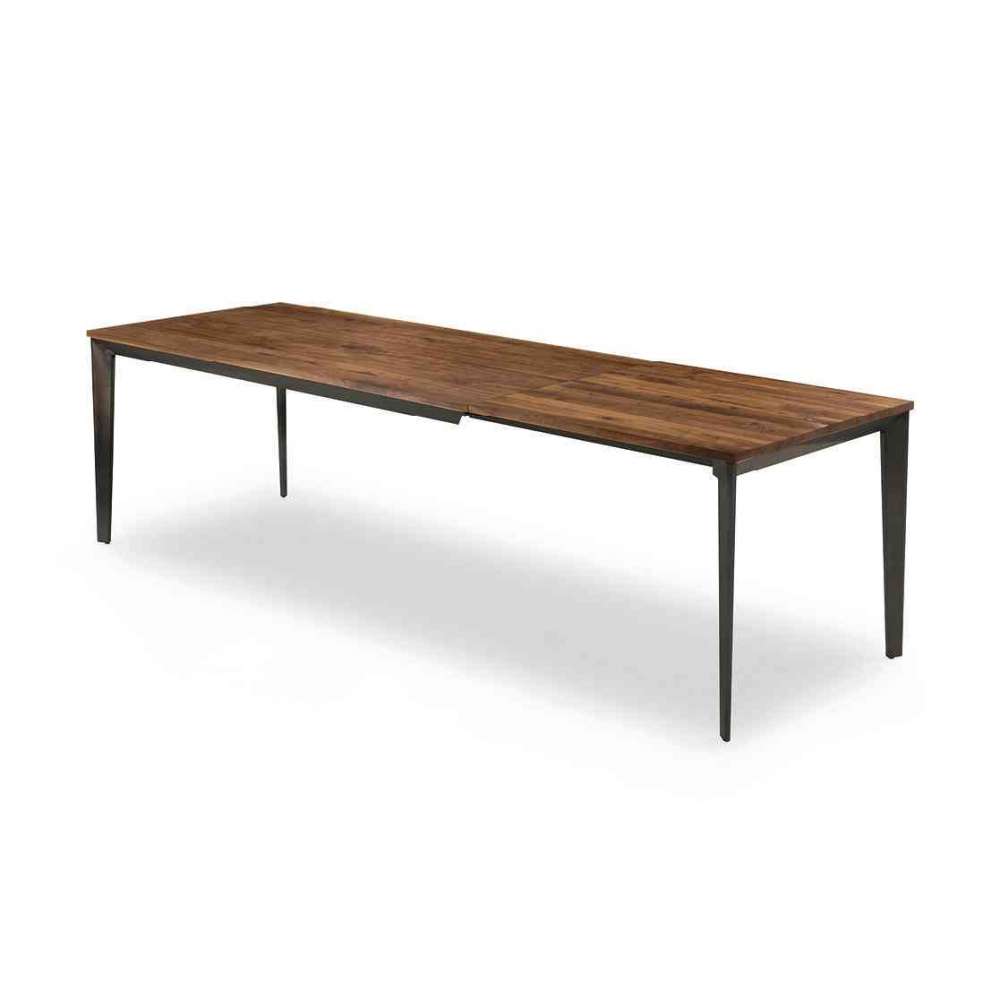 Stół rozkładany z blatem z litego drewna w listwach klejonych, z prostymi bokami i podstawą z żelaza. Wersja rozkładana wyróżnia się innowacyjnym i technologicznym systemem, z aluminiową ramą wyposażoną w urządzenie przesuwne doskonale zintegrowane z konstrukcją, która umożliwia przedłużenie o 100 cm.