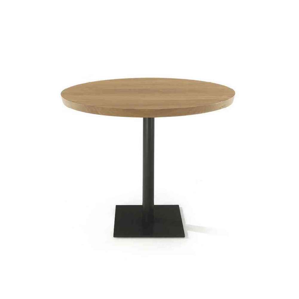 Okrągły lub kwadratowy stół z blatem z litego drewna w listwach klejonych, charakteryzujący się ukośnymi krawędziami umożliwiającymi łączenie z innymi elementami. Noga i płyta podłogowa z żelaza.