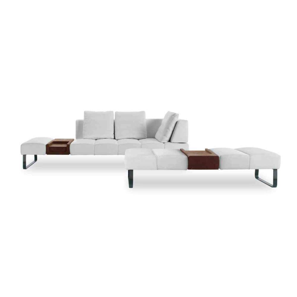 Wyściełana sofa z tapicerką i poduszkami ze skóry lub tkaniny z widocznymi przeszyciami. Z nogami z żelaza, dostępnymi w różnych kompozycjach i modułowych elementach, z których niektóre charakteryzują się elementami z litego drewna wykonanymi z jednego bloku, który staje się stołem roboczym, magazynowym lub ekspozycyjnym.
