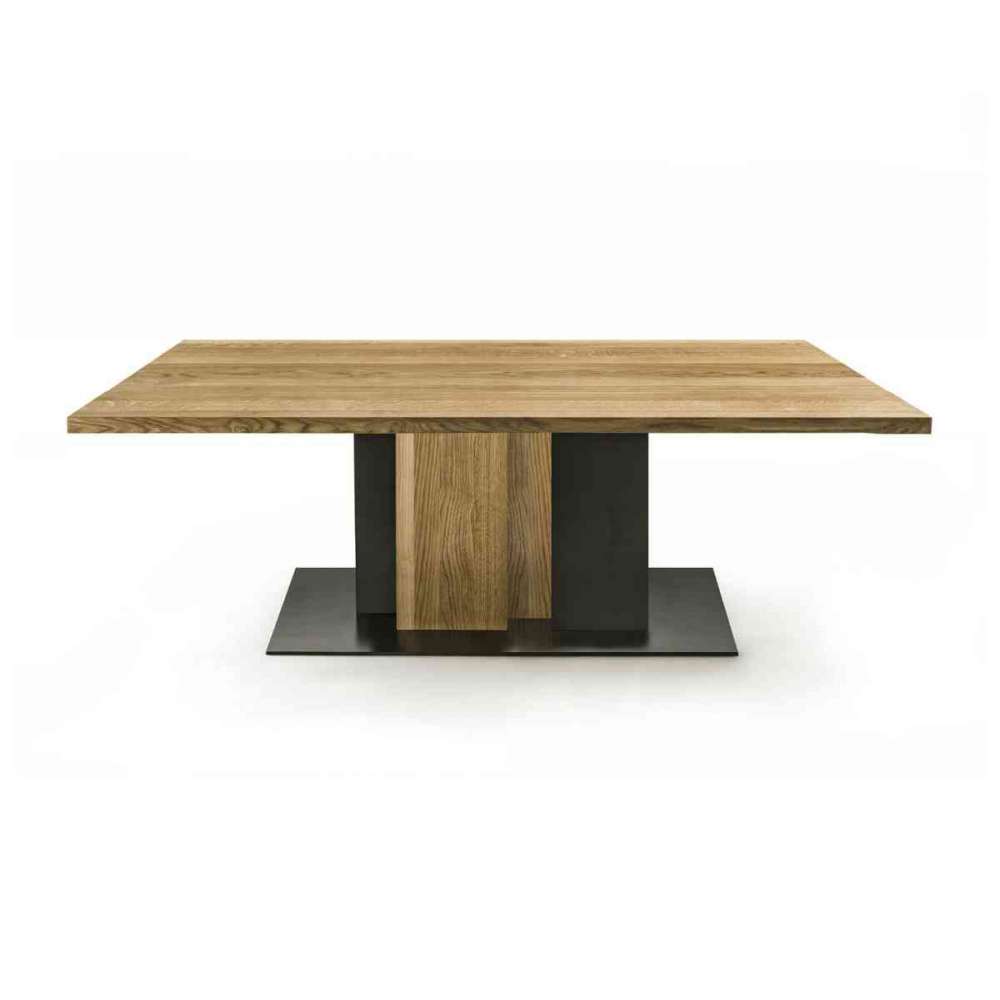 Prostokątny stół z litego drewna, z nogami wykonanymi z dwóch równoległościanów zintegrowanych ze sobą, jak przedmiot i jego cień.