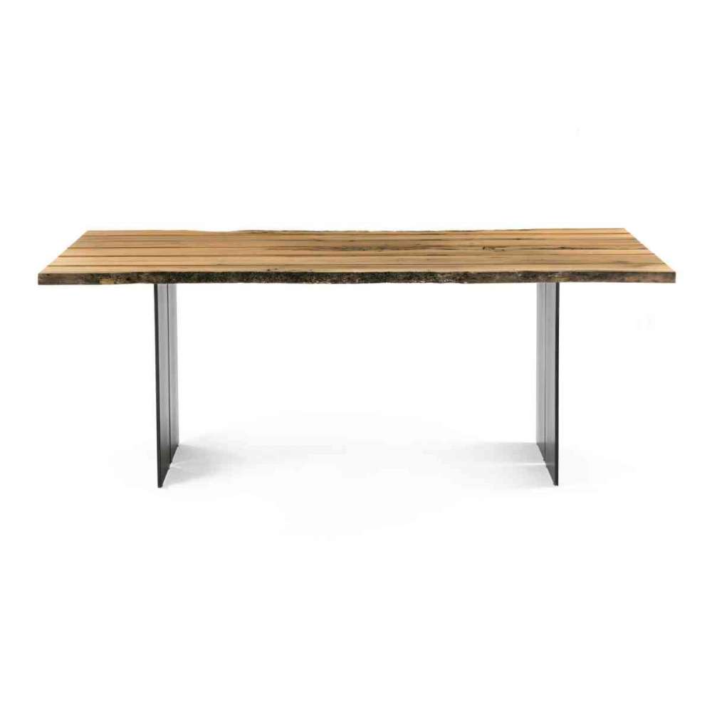 Stół z blatem z litej deski Briccola, nie klejonej, z naturalnymi bokami. Podstawa składa się z żelaznych nóg z centralną szczeliną. dł.200 x szer.90 x wys.76|dł.220 x szer.100 x wys.76|dł.240 x szer.100 x wys.76|dł.260 x str.100 x wys.76|dł. 280 x P.100 x W.76|Dł.300 x P.100 x W.76