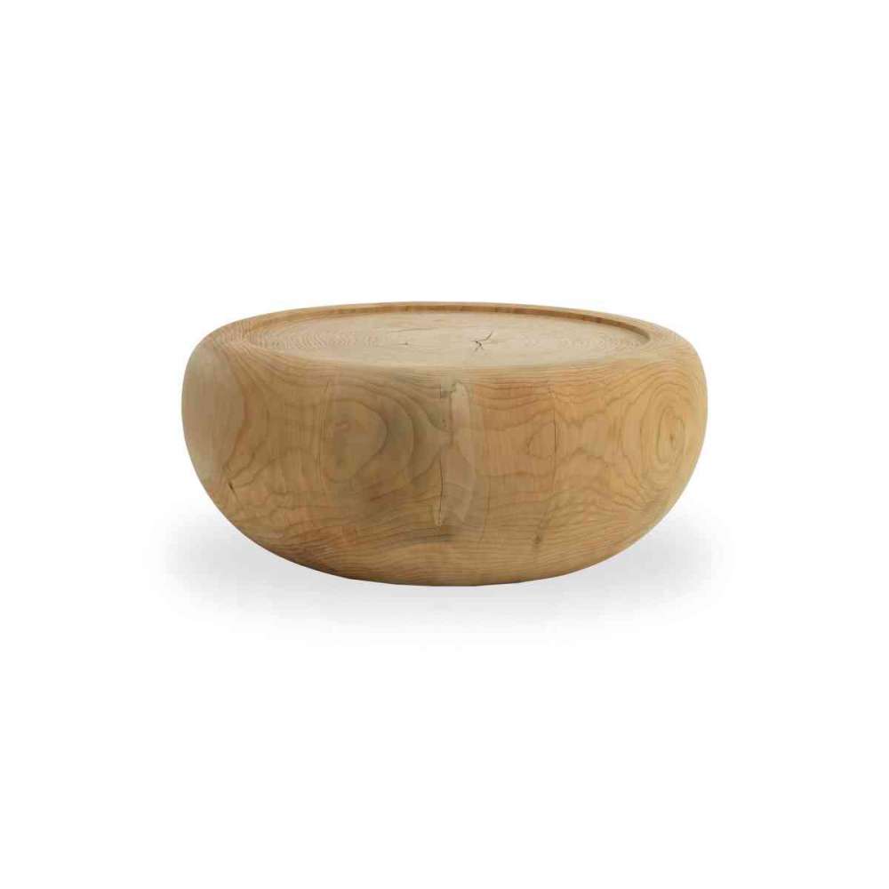 Stolik boczny z litego pachnącego cedru, wykonany z kawałka pnia drzewa, podkreślający typowe koncentryczne słoje drzewa.