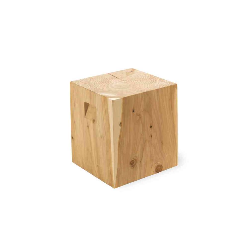 Mały stolik z litego pachnącego cedru, wykonany z kawałka pnia drzewa, dostępny w kształcie kwadratowym i okrągłym, wyposażony w boczne rowki ułatwiające chwyt. H.43,5
