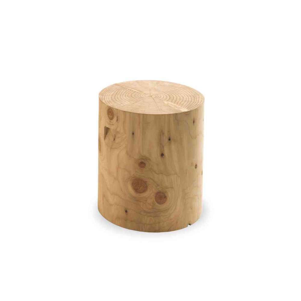 Mały stolik z litego pachnącego cedru, wykonany z kawałka pnia drzewa, dostępny w kształcie kwadratowym i okrągłym, wyposażony w boczne rowki ułatwiające chwyt. H.43,5
