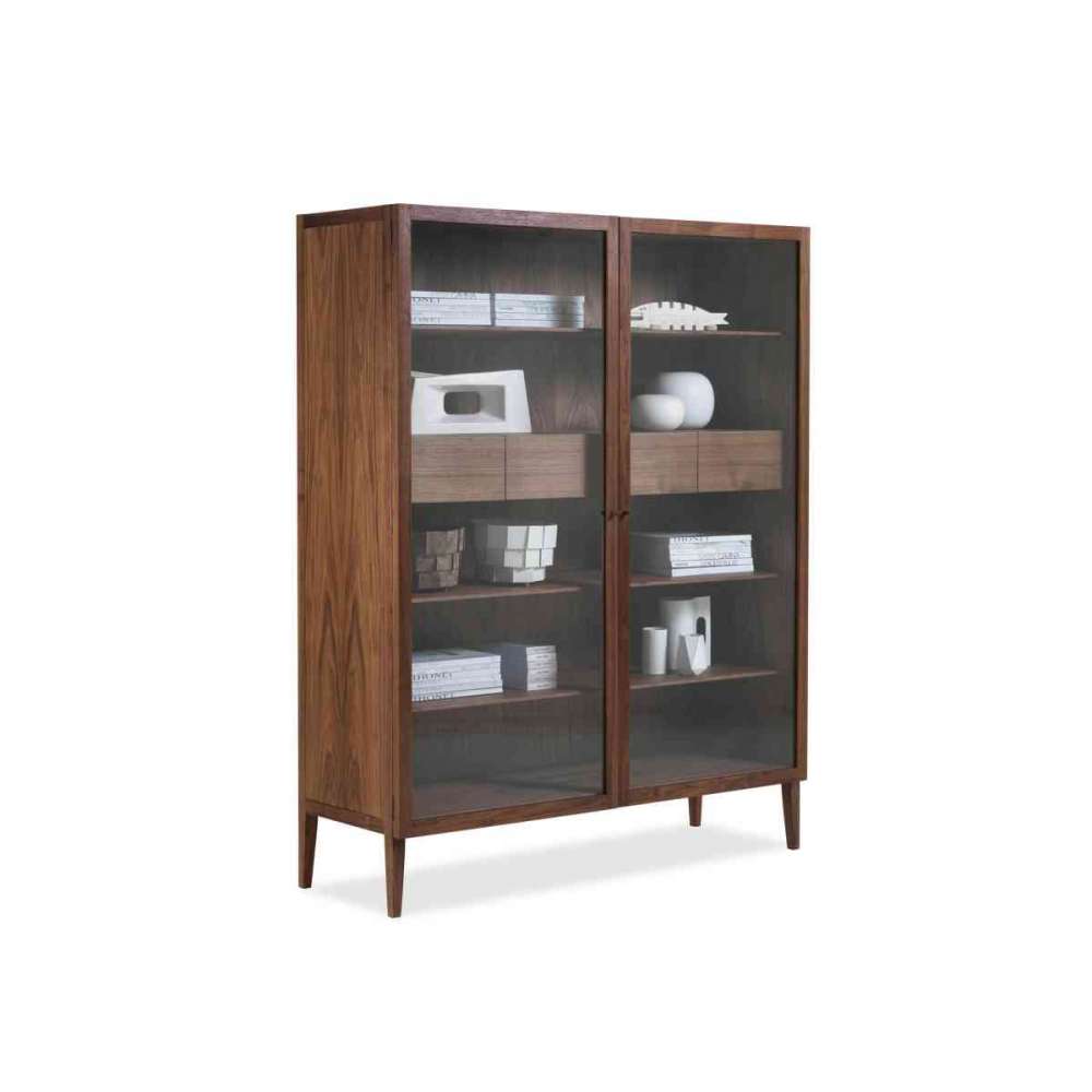 Witryna wykonana z litego drewna i płyty stolarskiej, z drzwiami z przezroczystego szkła z drewnianymi gałkami, dostępna z drzwiami podwójnymi lub pojedynczymi. Wewnętrzne szuflady są montowane na jaskółczy ogon. Cztery cienkie nóżki podnoszą urządzenie z ziemi.