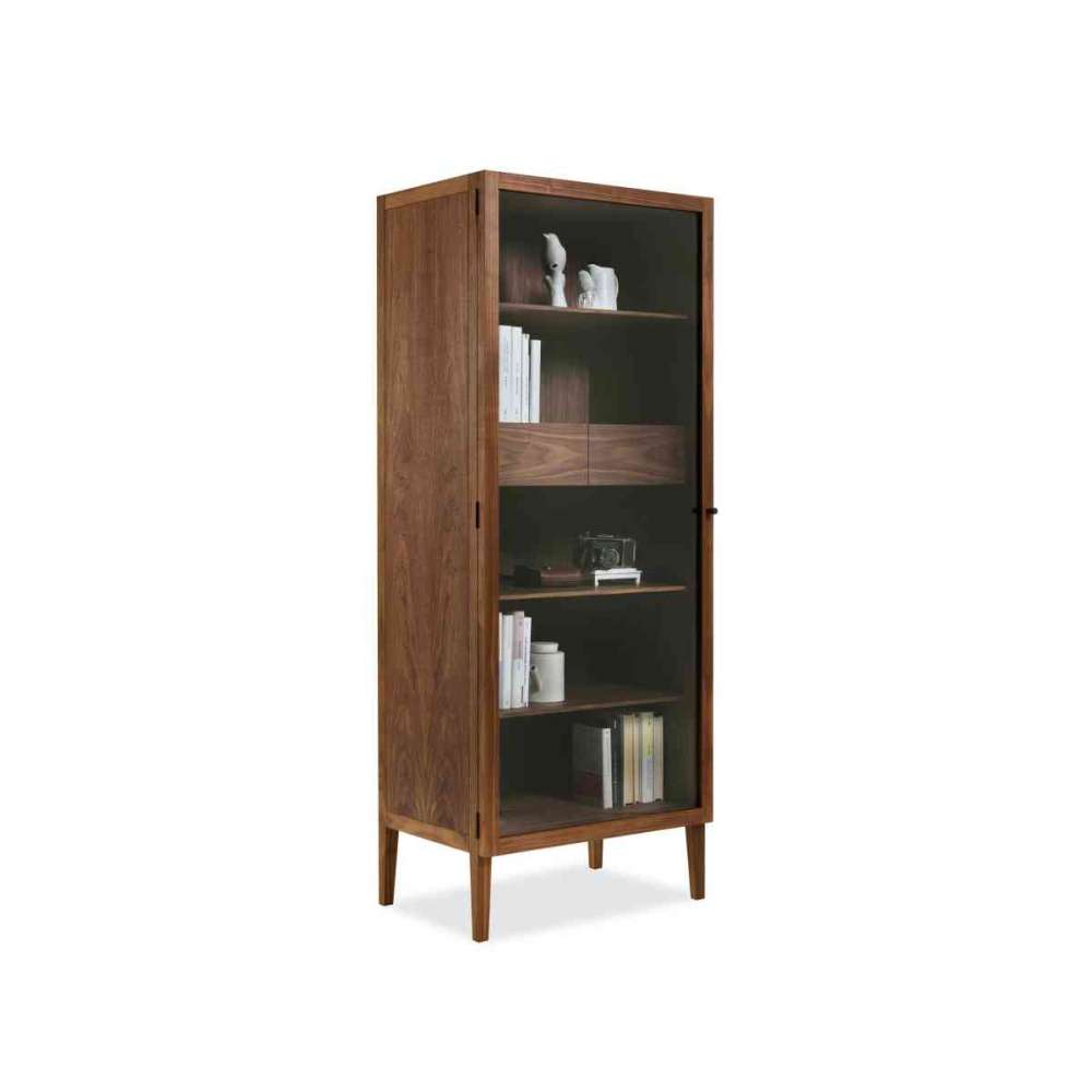 Witryna wykonana z litego drewna i płyty stolarskiej, z drzwiami z przezroczystego szkła z drewnianymi gałkami, dostępna z drzwiami podwójnymi lub pojedynczymi. Wewnętrzne szuflady są montowane na jaskółczy ogon. Cztery cienkie nóżki podnoszą urządzenie z ziemi.