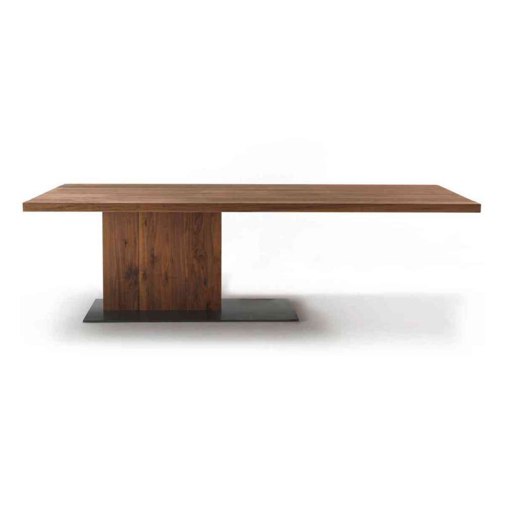Stół z blatem z litego drewna w listwach klejonych i bokach prostych, połączony z podstawą składającą się z drewnianej nogi asymetrycznej, ustawionej poprzecznie oraz płyty podłogowej z żelaza.