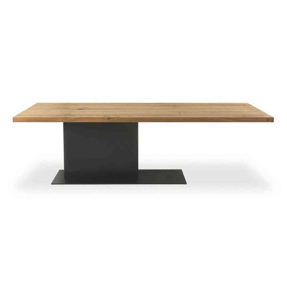 Stół z blatem z litego drewna w listwach klejonych i bokach prostych, połączony z podstawą z żelaza złożoną z asymetrycznej nogi ustawionej poprzecznie i płyty podłogowej. x P.110 x H.75|L.220 x P.100 x H.75|L.220 x P.110 x H.75|L.240 x P.100 x H.75|L.240 x P .110 x wys.75|dł.260 x szer.100 x wys.75|dł.260 x str.110 x wys.75