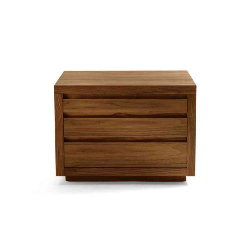 Stolik nocny z fornirowanej płyty stolarskiej, z 3 szufladami z frontami z litego drewna i montowany tradycyjnymi połączeniami na jaskółczy ogon.
