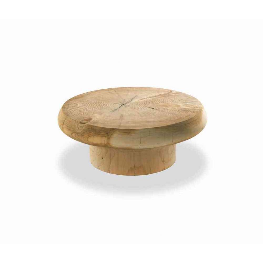 Stolik kawowy z litego, pachnącego cedru, wykonany maszynowo z pnia drzewa, charakteryzujący się asymetrycznym kształtem.