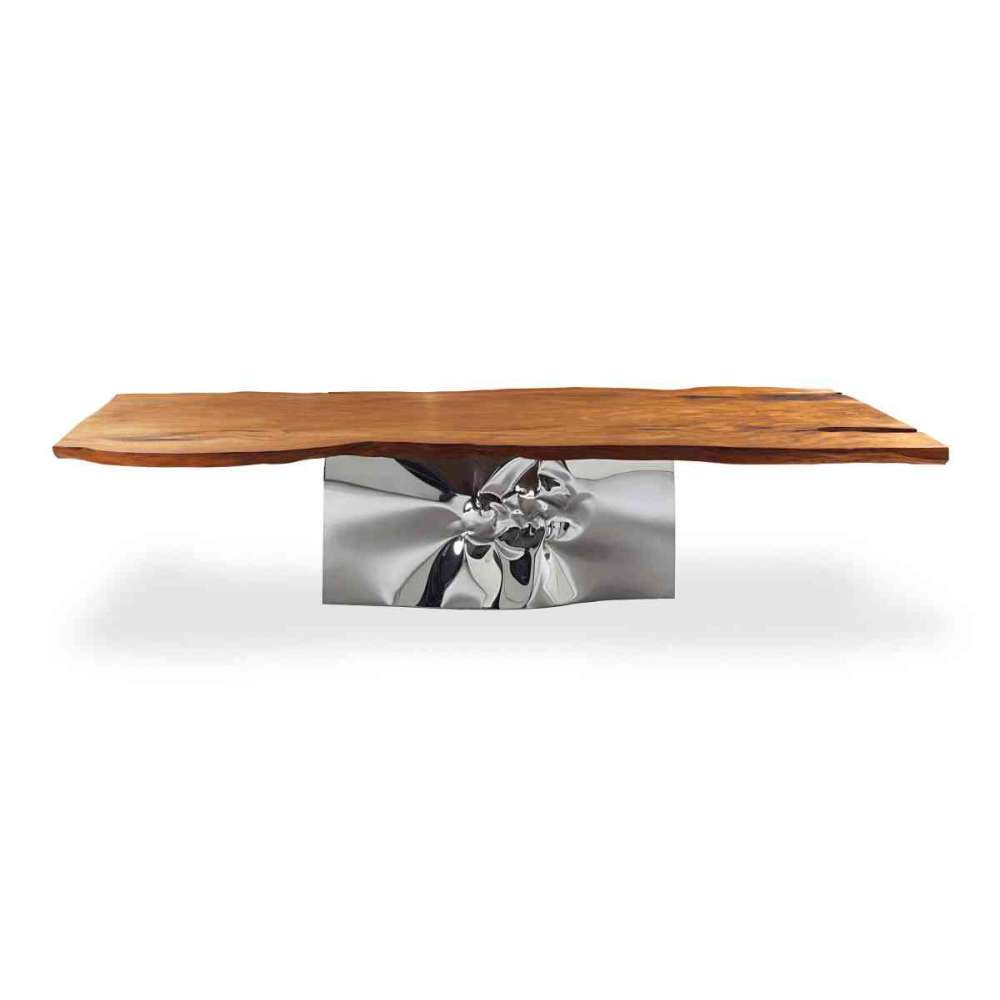 Stół z blatem z litego Kauri, z rzeźbioną podstawą wykonaną z blachy stalowej kutej przez światowej sławy artystę Helidona Xhixha.