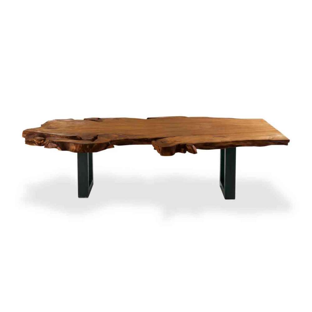Stół wykonany z blatem z litego Kauri, połączonym z żelazną podstawą o przekroju kwadratowym i widocznymi spawami.