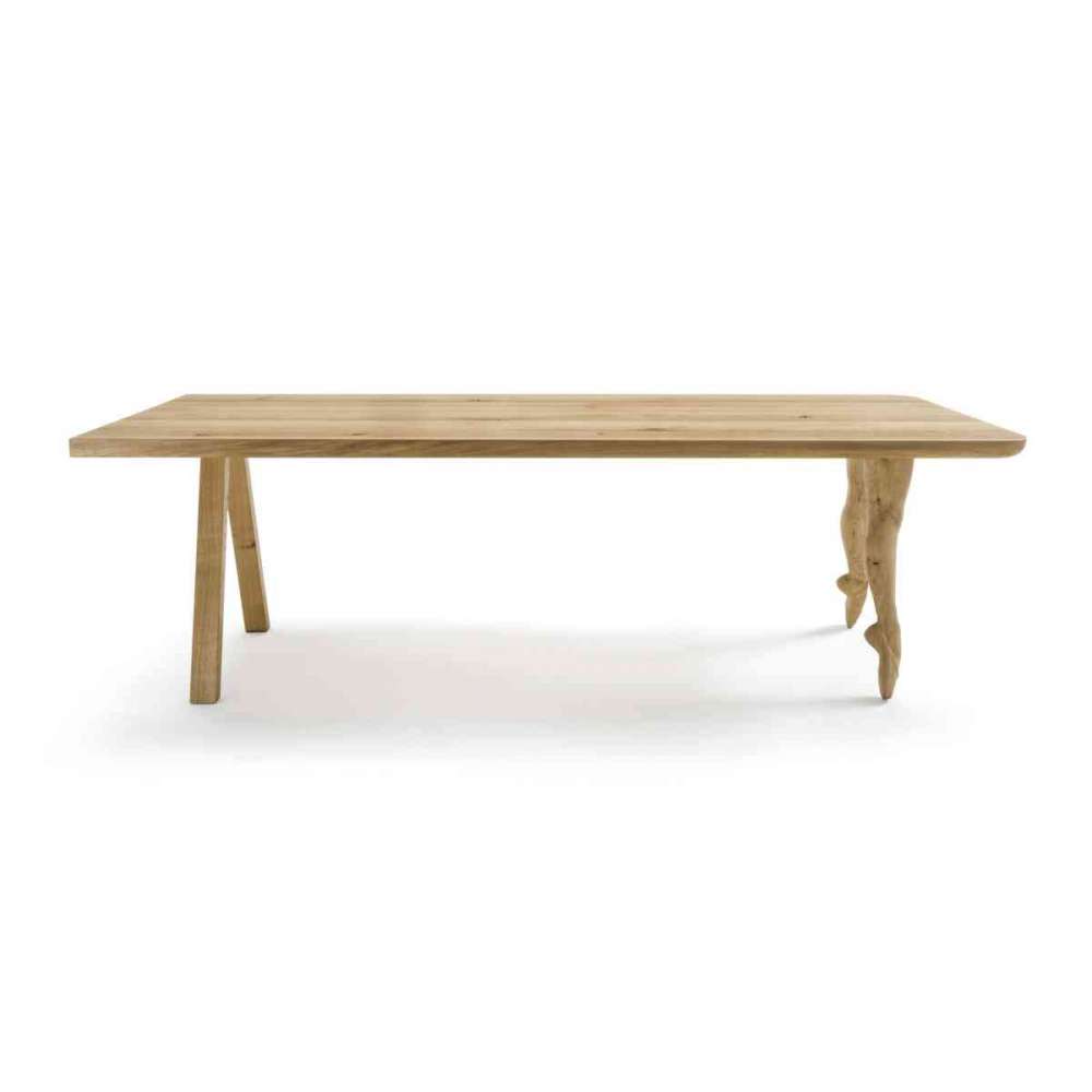 Stół wykonany z blatem z litego drewna w listwach klejonych, charakteryzujący się zaokrąglonymi narożnikami. Zaokrąglone boki na części góry. Podstawa składa się z 4 skośnych nóg, z których dwie przypominają nogi tancerki. .100 x wys.75|dł.260 x szer.100 x wys.75|dł.280 x szer.100 x wys.75