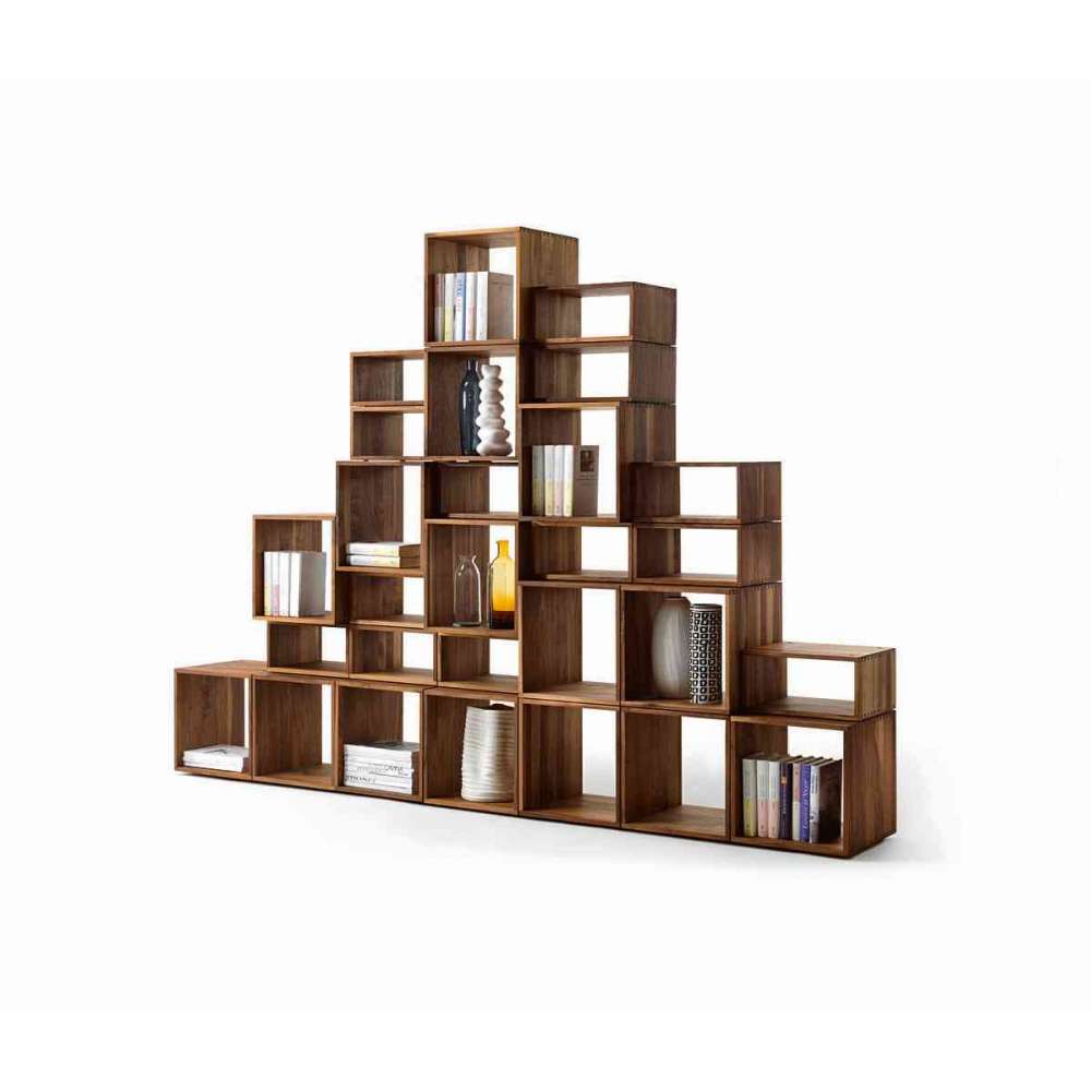 Regał na książki z litego drewna, składający się z modułowych elementów, które można układać w stosy i łączyć ze sobą za pomocą specjalnych elementów montażowych. Każdy element charakteryzowało 1,5 cm lite drewno i połączenia na jaskółczy ogon. Można go dopasować do różnych potrzeb meblowych, w tym oparcia, drzwi i szuflady zmontowane na jaskółczy ogon z systemem otwierania push-pull. Dostępny ze stałym lub obrotowym panelem TV, z obudową kablową. Dostępny z elementami „dwustronnymi”, może służyć jako przegroda pomieszczenia. 230,5|L.152,9 x P.38 x H.114,6|L.18,8 x P.0,3 / 1,5 x H.38|L.18,8 x P.30 x H.38|L.18,8 x P.38 x H.38|L.229,5 x P.30/38 x H.173|L.229,5 x P.30/38 x H.175| dł.267,8 x p.30/38 x wys.192,2|dł.38 x p.0,3 / 1,5 x wys.38|dł.38 x wys.18,8