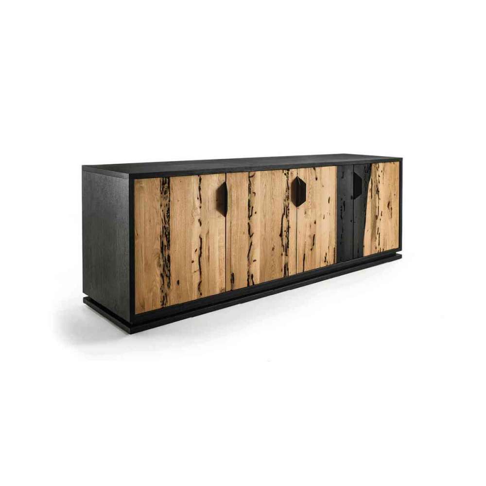 Niska płyta z litego drewna i płyty stolarskiej, z konstrukcją i cokołem z całkowicie czarnego dębu pigmentowanego. Z czterema drzwiami w kolorze Briccola (z całkowicie czarnymi pigmentowanymi wstawkami) i wystającymi żelaznymi uchwytami