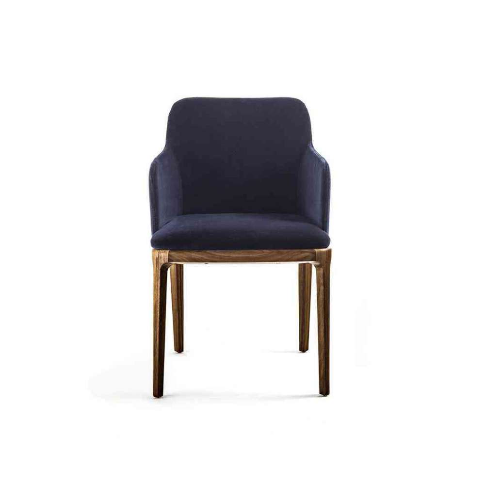Eleganckie krzesło z nogami z litego drewna i konstrukcją wykonaną z poliuretanu z oparciem i siedziskiem w ciągłej linii. Wersja z podłokietnikami, z pokryciem ze skóry lub tkaniny